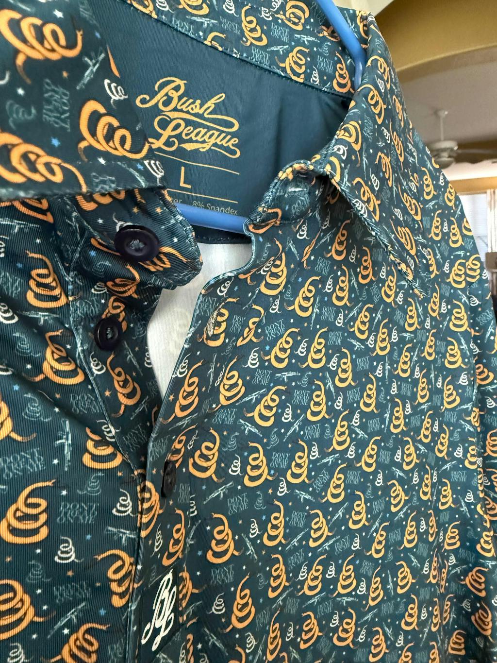 Bush League hit another home run with the Dropping Bombs polo! Size and fits perfectly, love the graphics. This is my second shirt but will definitely be getting more!!