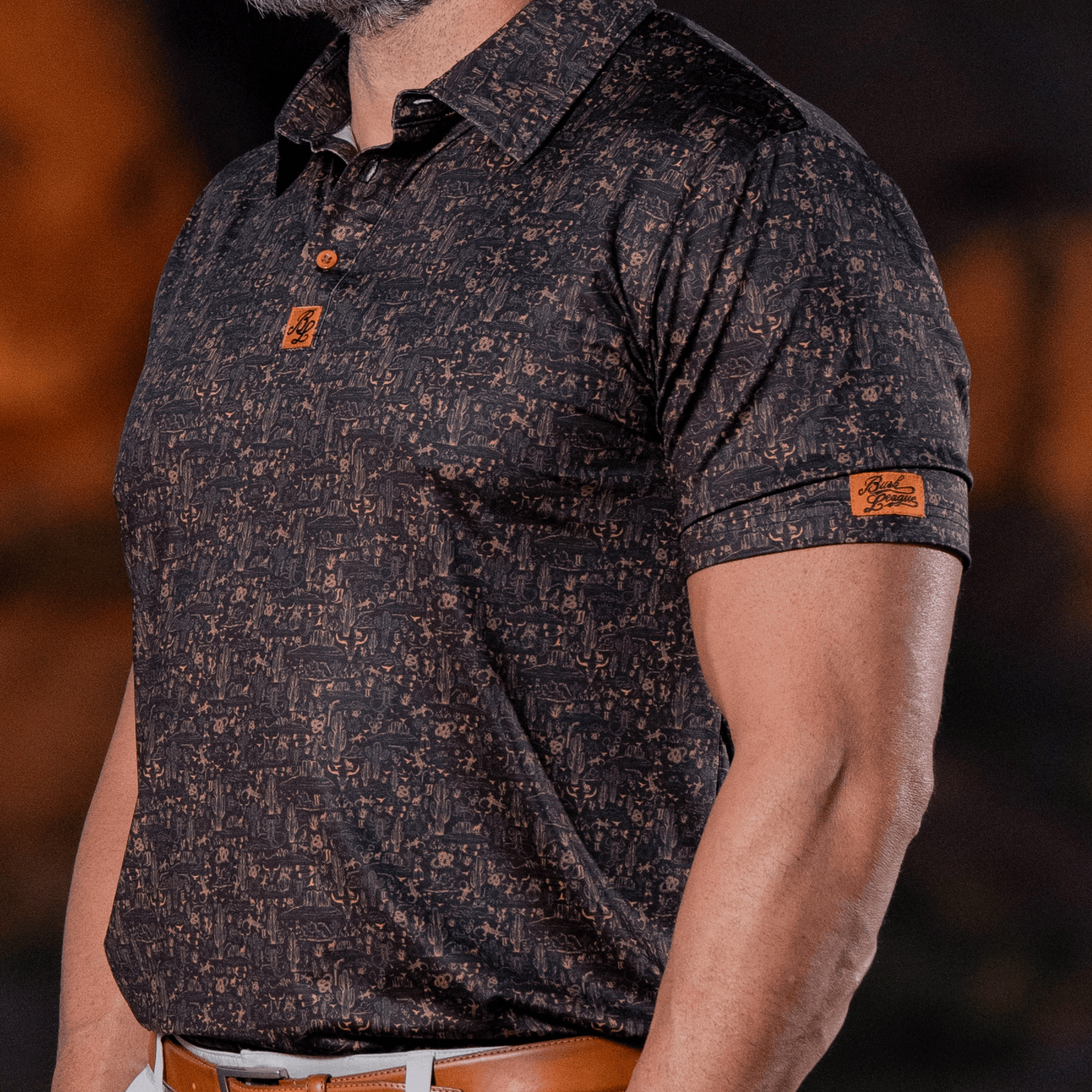 "The Desert" Polo brings a bold, rugged vibe to the course with a deep black base and a striking copper-colored pattern featuring desert icons like snakes, scorpions, cacti, and more. It’s a nod to the wild beauty of the Southwest, designed for golfers who like their style sharp and their game even sharper.